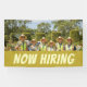 Bold & Readable: Yellow-gold banner background with high-contrast “NOW HIRING” text grabs attention.