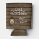 Rustic antique lantern and pine cones over barn wood design. Eat, drink and be married typography style text can holder with the bride and groom's names and wedding date to customise.