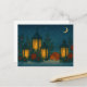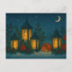 A cosy winter night: lanterns glowing in the snow, a fox curled up by the warmth, and holly scattered under a starry sky.