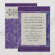This wedding invitation features a dark purple blue background with images of three different vintage damasks and faded leaves. Lapis and silver grey.