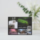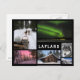 Collage postcard of various landscapes and icons of Lapland in winter, like husky safari, skiing, northern lights and log cabins with lots of snow with a black frame and the text: 'Lapland'. Great winter souvenir!