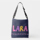 Pretty graphic L monogram name bag design. Ideal for a personalised gift for a girl who has a name Lara. This example reads Lara. Background colour currently navy blue but you can also change this to your own choice of colour if required. Ideal as a special birthday or celebration gift. If you need help with your own personalised name please contact me. Capital letter L typographical hearts and flowers drawing and graphic conversion in shades of bright pink and purple © unique art text and design by Sarah Trett. www.sarahtrett.com for www.mylittleeden.com