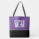 Cheer moms carry all your gear with you in this cute stylish large tote bag shown in a purple and black colour block.