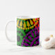 This mug has a Black History design of large circles formed from raindrop shapes and circles in red, yellow, purple, green, and turquoise.
