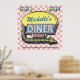 Create your own custom, 1950's style diner sign wall poster using this easy template. These cool retro posters have a slightly distressed pink-and-white checkered background with a sign on top that says "DINER" and "OPEN" in neon with space for you to add your own first or last name - or any other word you'd like. The sign also has a lighted arrow graphic and space for you to add a slogan and the year your diner, home kitchen or 50s theme bar was established (or the year your party is being held). It's all done in shades of pink, white, black, blue, yellow, gray and red. Just fill in the easy diy template or click "Customize It" if your text runs long & you need to resize, rearrange or change text colors & fonts. Don't forget to pick the poster size you want (square shapes work best for this design).