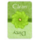 Stylish dishwasher magnet, in a green swirl pattern, and a paisley pattern, with the white text reading Clean, on one half of the magnet and green text reading dirty, on the other half. Pretty graphics of a green ribbon, across the middle is decorated with a green flower. Makes a great hostess gift.