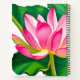 Journal in a large closeup image of a water lily, in shades of pastel to medium coral pink, with emerald green leaves