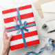 A wrapping paper designed with a red and white striped pattern in large size. You can change the red for a different colour.