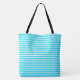 This tote bag is shown with a fun turquoise blue and white striped print design. Large size shown. Has Black straps.