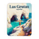 This prompt captures the traveler discovering Las Grutas' key attraction. A lone female traveler with a sun hat stands near the edge of a large, stylized sea cave at the base of the white cliffs. The vibrant, clean-lined illustration shows her looking out across the calm, transparent, turquoise water of the gulf, which creates strong graphic fields of flat, deep blue against the textured white rock. Bright sunlight illuminates the scene, casting crisp, defined shadows and accentuating the warm, sun-drenched atmosphere and strong negative space of the vast coastal landscape.