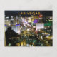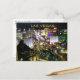 This postcard has a night time aerial view of The Strip - Las Vegas Boulevard, sparkling with neon casino lights on the famous Nevada destination. This photograph's view is looking north towards Las Vegas's own version of the Eiffel Tower.