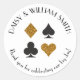 Faux gold glitter and black card suits are circled by customisable text making these round stickers perfect for all kinds of projects and occasions. Use them to label favours for wedding guests, to close envelopes and more.