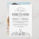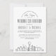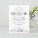 It features a modern deco-style illustration of the city's skyline resting towards the bottom. Centred above this are the names of the wedding couple and your wedding day information in matching open-lined style text. This is presented in a neutral black and white, classic colour theme.
