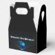 Fun, laser tag themed birthday party favour box is black. On the front and back of the box are blue laser beams shooting out. There is text in white font where you can add your own birthday message, etc. There is a blue laser gun below the text. This fun design is perfect for laser tag themed parties and outer space themed parties as well.