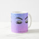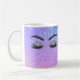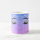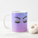 Modern girly glam lashes and brows salon coffee mug with beautiful makeup eyes and brows over a holographic ombre gradient purple mauve, and lilac lavender glitter sparkling background. +++++++++++++++ Personalise it with technician and pastel purple salon name.