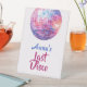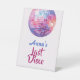"Party Pedestal Sign! Featuring a vibrant pink disco ball and retro “Last Disco” lettering, this sign sets the perfect tone for your disco-themed celebration. Whether it’s greeting partygoers at the entrance or adding flair to your décor, this pedestal sign is a glamourous centerpiece that shines bright all night long. A must-have for the bride’s last disco bash—elegant, eye-catching, and full of fun!"