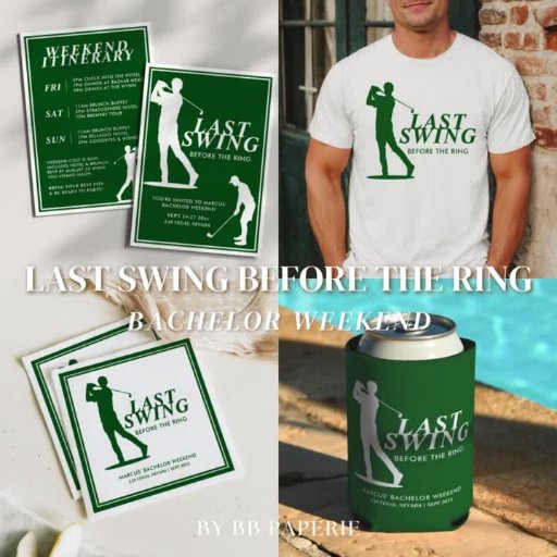 The Last Swing Before the Ring suite is a refined, golf-inspired bachelor weekend collection that blends preppy charm with a touch of playful spirit. Featuring a bold golfer silhouette in deep green and crisp white, this collection tees up the perfect design for a classy celebration on the course. With clean lines, athletic flair, and timeless typography, this suite is made for grooms who'd rather swap vows after one last round with the boys.