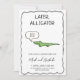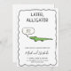 A fun going away party invitation with a smiling alligator. The card is easy to customise with your wording, font, font colour, paper shape options and choice of paper types. Not exactly what you're looking for? All our products can be custom designed to meet your needs at no extra charge. Simply contact us
