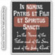 Here are the Latin words to the ancient Sign of the Cross -- "In the Name of the Father, and of the Son, and of the Holy Ghost." The words appear in mediaeval-inspired Art Nouveau lettering, with the English in handwritten script font. Great for your car or your journal -- or just to stick in some random place to remind people that God is in charge!