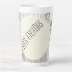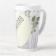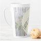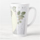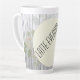 Latte everyday inscribed on a silver wood panel backdrop to create a rustic vibe with a tan sphere with a leaf and floral wreath with the wording inside the sphere.