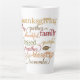 This large size latte mug is shown with a festive Thanksgiving messages print.