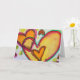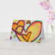Peach and orange hearts connect like blowing bubbles drift together. A green outline traces each heart. Pale yellow colour dots are like confetti between the hearts. The watercolor painting has a light layer of gold and pink on top. Personalise this card with your own text and images using the customise it option. Detail from Inspirational Word "Laugh" painting.