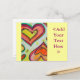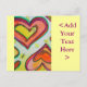 Yellow, peach, and orange hearts form two concentric hearts gliding towards each other tip to tip. Pale yellow colour dots are like confetti between the hearts. The watercolor painting has a light layer of gold and pink on top. Personalise this postcard with your own text and images.