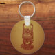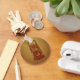 Dark red laughing Buddha wood-cut style image with hands upraised.