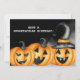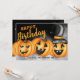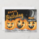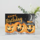 Three laughing carved pumpkins bring your Happy Birthday wishes on this Halloween birthday card template. The jack-o-lanterns rise out of a fog that creates just a bit of a creepy vibe against the black background. Happy Birthday is written in a trendy font combination in orange and yellow. Your name is below. The back of the birthday card features the same Halloween pattern and a birthday greeting that you can personalise. In fact, all of the text can be easily customised. Sending a birthday card is the perfect way to stay in touch during the fall season.