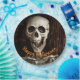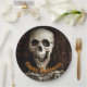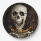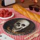 Fun Halloween paper party plates feature slightly creepy, kinda funny photo of laughing skeleton with customisable text