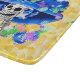 Lovely calavera sugar skull wearing a pretty blue bonnet and set on yellow floral background. A nice addition to your kitchen decor for Dia De Los Muertos.