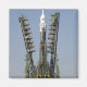 Launch scaffolding is raised into place around the Soyuz rocket