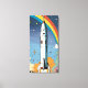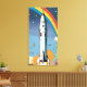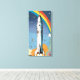 A sleek space rocket blasts off, its trail of fire and smoke rendered in vibrant rainbow retro artwork, creating a striking fusion of futuristic propulsion and nostalgic colour. The dynamic hues streak across the sky, evoking a sense of wonder and excitement as the rocket ascends into the cosmos.