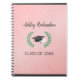 Modern black cap, turquoise laurel wreath, and diploma over pink background