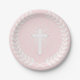 A pretty paper plate for a religious event in pink with white laurel border and white cross with starburst. Coordinating items available.