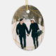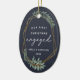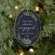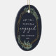 Celebrate your first Christmas as an engaged couple with this charming and festive ornament. Design features "our first Christmas engaged" in modern block and script lettering, surrounded by a faux gold foil border accented with green winter leaves. Personalise with your names and the year, and add a photo to the back with a matching golden geometric frame.