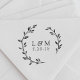 Custom-designed Save the Date self-inking monogram stamp featuring rustic hand-drawn laurel wreath with bride and groom/couple's initials and wedding date. Personalise this elegant wedding stamp today to give your envelopes a touch of style!