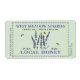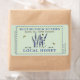 Pale green label with a blue dotted border and vintage lavender illustration with bees. Blue Text