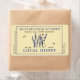 Yellow label with a blue dotted border and vintage lavender illustration with bees. Blue Text