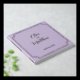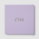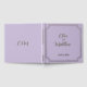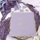 Wedding guest book in soft lilac tones with gold foil lettering written with script and serif fonts, with the couple names and wedding date inside a gold frame at the front and couple initials at the back