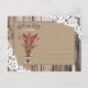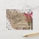 Barn wood and red wine lavender bouquet in mason jar with burlap and lace tied with twine and white lace over linen-look background rustic country save the date postcard.