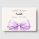 A beig, cream background colour. Decorated with a large lavender, violet coloured bow. Personalise and add your name, age.