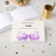 A beig, cream background colour. Decorated with a large lavender, violet coloured bow. Personalise and add your name, age.