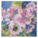A spray of watercolor flowers in shades of blue, lavender, pink and violet is backed by brushstrokes of metallic gold and a rich dark blue background.