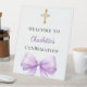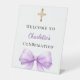 A large lavender colored bow and a golden cross as decoration. Personalize and add her name.