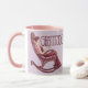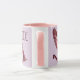 This mug displays a stylized Art Nouveau illustration of a woman in a burgundy dress sitting in a rocking chair on a lavender background. The woman is in profile view, reclining in the chair with eyes closed and one hand in a meditation pose. The rocking chair features elaborate curved wooden details with decorative scrollwork and a fan-like ornament at the top. The text GRATITUDE appears in burgundy letters at the top of the image. The illustration has a vintage, decorative quality with a color palette of burgundy, pink and lavender tones. The chair's design includes flowing curves and natural motifs typical of the Art Nouveau style. The image is on both sides of the mug. The mug is a pink and white combo mug. The mug has a pink handle and a pink glaze interior.