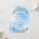 A white and blue sky as background decorated with lavender flowers and eucalyptus greenery. Personalise and your names and details.