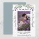 A modern wedding Save the Date photo card. Decorated with lavender florals, flowers and eucalyptus greenery. Personalize and add your photo, date, names.