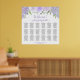 This beautiful 18 table wedding seating chart features a rustic boho chic design with hand painted watercolor roses and blossoms in shades of dusty purple and lavender, along with eucalyptus leaves and garden greenery. The elegant script calligraphy title reads: Welcome! Please find your table. There is space for 180 guests with 10 seats per table and the couple's names and wedding date appear at the bottom. Wonderful way to add beauty, style, and charm to your wedding reception, while making it easy for your guests to find their tables.