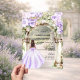 A clear, transparent background. A large marble arch decorated with lavender, violet coloured florals. A girl with a lavender coloured dress. Personalise and add a name and details.